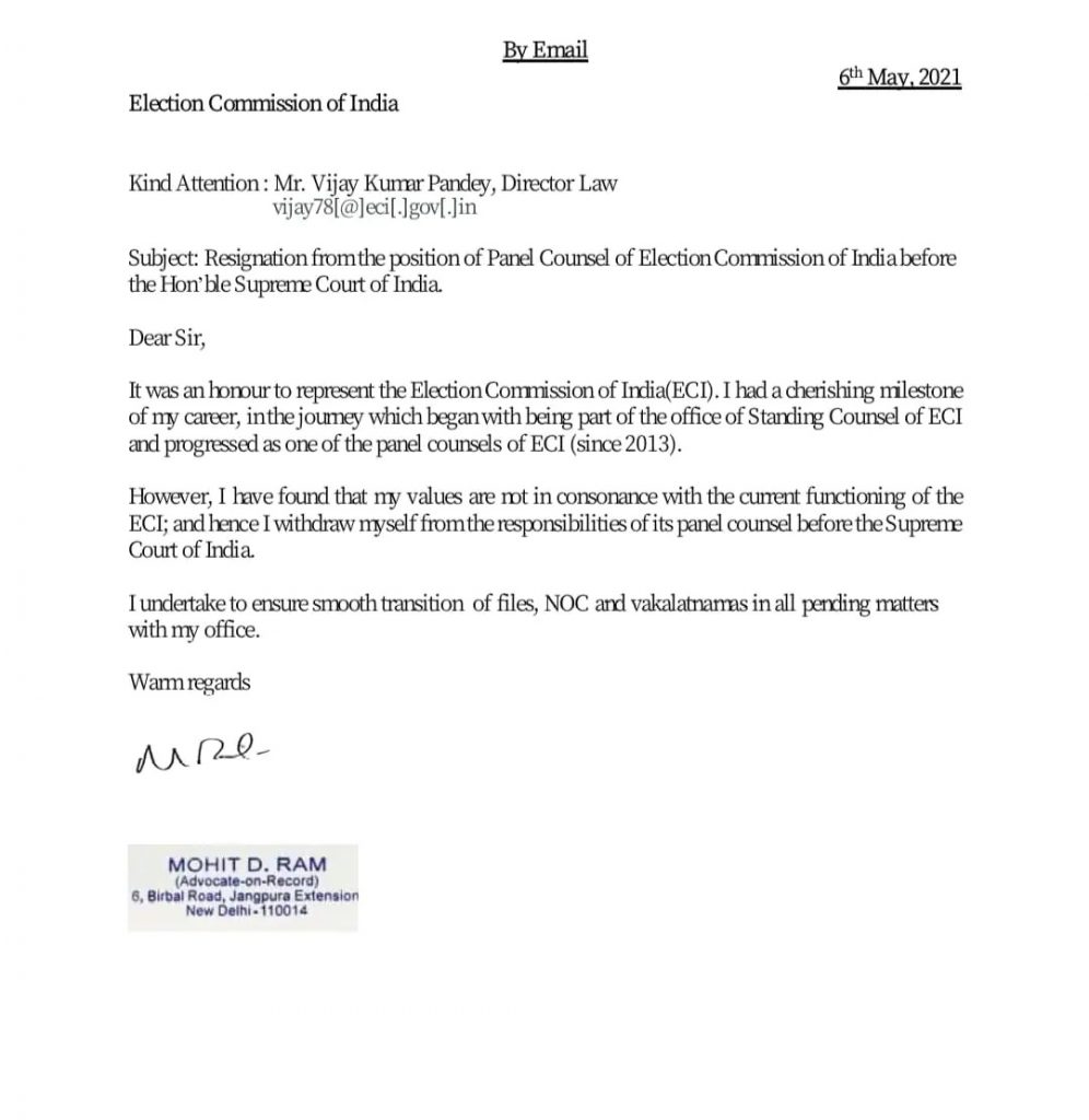 नई दिल्ली। 2013 से सुप्रीम कोर्ट (Supreme Court) में चुनाव आयोग (Election Commission) का प्रतिनिधित्व कर रहे एक मोहित डी राम वकील ने आयोग के वकीलों के पैनल से इस्तीफा दे दिया है। वकील ने इस्तीफा में कहा कि- “मैंने पाया कि मेरे मूल्य निर्वाचन आयोग के मौजूदा कामकाज के अनुरूप नहीं हैं और इसलिए मैं सुप्रीम कोर्ट के समक्ष इसके पैनल के वकील की जिम्मेदारियों से अपने आप को मुक्त करता हूं।” उन्होंने कहा मैं अपने कार्यालयों में सभी लंबित मामलों में फाइलों, NOC और वकालतनामाओं का सुचारू रूप से ट्रांसफर (Transfer) करता हूं।