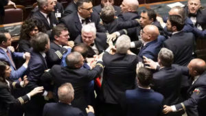 संसद के भीतर हुए हंगामे ने इटली की राजनीति में उफान ला दिया है। इस घटना को इतालवी अखबारों के पहले पन्ने पर जगह मिली है। बड़ी संख्या मे लोगों ने निर्वाचित प्रतिनिधियों के बीच हुए इस झगड़े की कड़ी आलोचना की है। इटली के प्रमुख दैनिक कोरिएरे डेला सेरा ने कहा है कि हमारी पार्लियामेंट ‘बॉक्सिंग रिंग’ में बदल गया है। प्रधानमंत्री जियोर्जिया मेलोनी की पार्टी के सांसदों ने डोनो पर इस घटना को भड़काने और यहां तक कि अपनी चोटों का नाटक करने का आरोप लगाया। इटली की सरकार के लिए ये इसलिए भी शर्मिंदगी की वजह बन रहा है क्योंकि देश में जी-7 समिट चल रहा है।