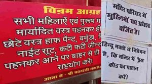 अलीगढ़: अलीगढ़ के हजारों वर्ष पुराने ऐतिहासिक हनुमान जी के मंदिर में मुस्लिम महिला और पुरुषों की एंट्री को बैन किया गया है. इतना ही नहीं हिंदू महिला और पुरुष भक्तों के लिए भी ड्रेस कोड जारी किया गया है. छोटे कपड़े और कटी फटी जींस पहनकर मंदिर में प्रवेश वर्जित किया गया है. कहा गया है कि हिंदू पुरुष भक्त मंदिर में कटी-फटी जींस और छोटे कपड़े पहनकर पूजा नहीं करेंगे. मंदिर के महंत ने इस बाबत एक गाइडलाइन जारी की है. महंत का मानना है कि अशोभनीय वस्त्र पहनने से पूजा करने आए भक्तों का ध्यान भटकता है. मंदिर के बाहर लोगों को जागरूक करने के लिए पर्चे भी लगा दिए गए हैं.