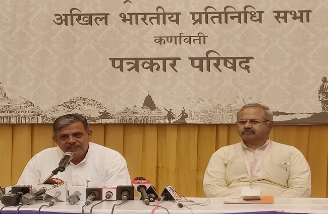 राष्ट्रीय स्वयंसेवक संघ की अहमदाबाद स्थित कर्णावती में तीन दिवसीय अखिल भारतीय प्रतिनिधि सभा की बैठक का रविवार को समापन हुआ। इस अवसर पर आयोजित पत्रकार वार्ता में सरकार्यवाह होसबाले ने बताया कि संघ कार्य का भौगोलिक और अन्य आयामों के जरिए विस्तार किया जाता है। वहीं वर्ष में तीन बार इस विस्तार कार्य की समीक्षा होती है। बतौर सरकार्यवाह संघ अपने शताब्दी वर्ष से पूर्व देश के हर इलाके तक अपनी पहुंच बढ़ाना चाहता है। होसबाले ने बताया कि मौजूदा समय में देश के 50 फीसदी मंडलों (ग्रामीण इलाके) में संघ सक्रिय रूप से काम कर रहा है, लेकिन आगामी 2 वर्षों में अन्य इलाकों में भी संघ पहुंच जाएगा। इन क्षेत्रों में सामाजिक समरसता, शिक्षा, स्वास्थ्य, संस्कृति को बढ़ावा देना संघ का उद्देश्य है। सरकार्यवाह ने कहा कि ग्रामीण इलाकों के साथ-साथ शहरी बस्तियों में भी संघ कार्य का विस्तार किया जाएगा।