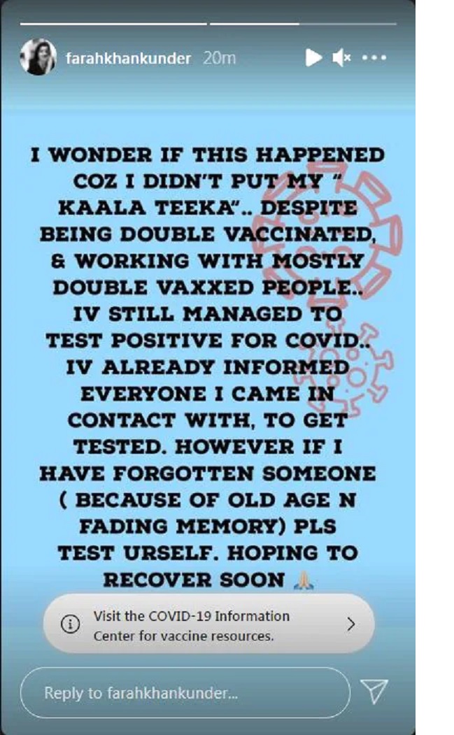 फराह खान ने अपने इंस्टाग्राम अकाउंट पर लिखा है, मुझे हैरानी है कि क्या ऐसा इसलिए हुआ कि मैंने काला टीका नहीं लगाया। पूरी तरह से वैक्सीनेटेड होने और दोनों वैक्सीन लगवा चुके लोगों के साथ काम करने के बावजूद मैं कोरोना पॉजिटिव हो गई हूं। मैंने सबको बता दिया है कि जो भी मेरे कॉन्टैक्ट में आया है, अपना टेस्ट करवा ले। हालांकि हो सकता है कि मैं किसी को भूल गई हूं (क्योंकि उम्र हो गई है और यादाश्त कमजोर है) प्लीज अपना टेस्ट करवा लें। उम्मीद है जल्दी ठीक हो जाऊंगी। फराह खान के इंस्टाग्राम पर शिल्पा शेट्टी और शाहरुख खान के साथ पोस्ट दिखाई दे रहे हैं। वह सुपर डांसर के सेट पर थीं। हालांकि शाहरुख के साथ उनका वीडियो नया है या पुराना ये कंफर्म नहीं हैं। फराह जी कॉमेडी शो भी जज करती हैं।