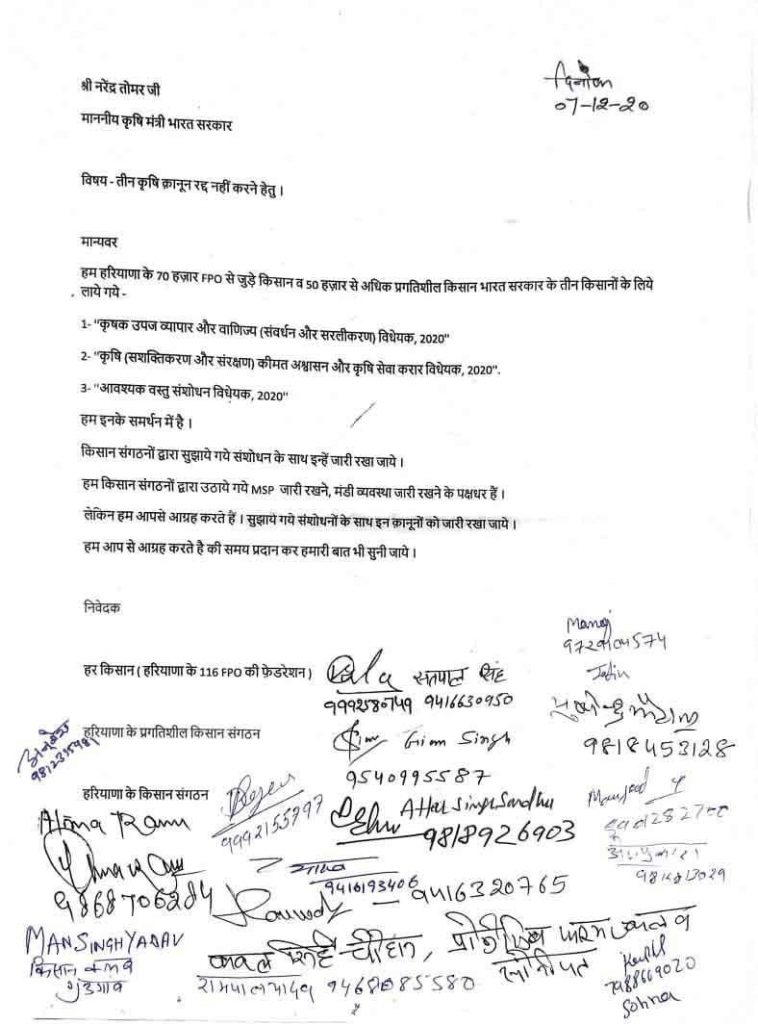 इन किसान संगठनों ने कृषि मंत्री से कहा कि लेकिन हम आपसे मांग करते हैं कि किसानों के सुझावों को शामिल करते हुए इन कानूनों को जारी रखा जाए. समाचार एजेंसी के मुताबिक प्रगतिशील किसान संगठन, सोनीपत के अध्यक्ष कंवल सिंह चौहान ने कहा कि विरोध कर रहे किसानों को गुमराह किया जा रहा है. पीएम ने भरोसा दिलाया है कि एमएसपी और मंडी सिस्टम बना रहेगा.