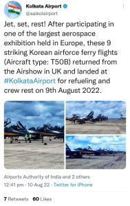 अब सवाल ये है कि जब युद्ध नहीं है, तो फिर अचानक से कोलकाता एयरपोर्ट पर ये फाइटर जेट कर क्या रहे है? तो इसका जवाब मिला एयरपोर्ट के अधिकारियों से. उनका कहना है कि एयरपोर्ट इन विमानों को शेल्टर दे रहा है. बुधवार को कोलकाता एयरपोर्ट अथॉरिटी ने इसे लेकर एक ट्वीट भी किया है. इसके हिसाब से ये कोरियन फाइटर जेट कोलकाता एयरपोर्ट पर ईंधन भरवाने और पॉयलटों के आराम के लिए उतरे हैं.