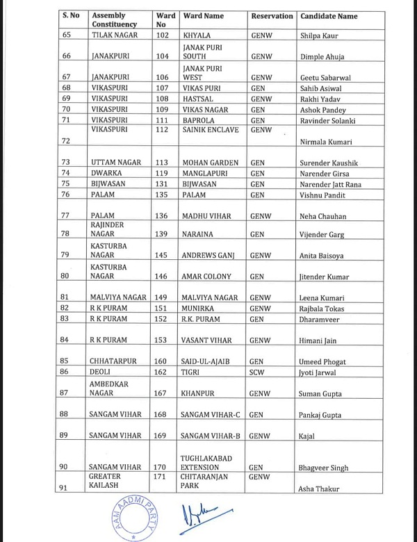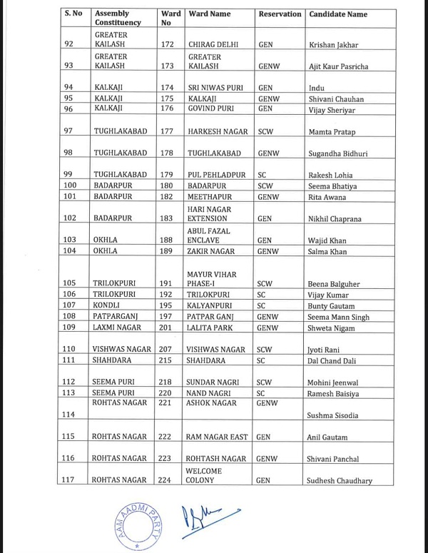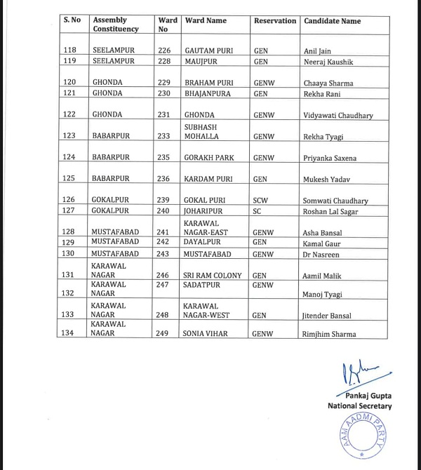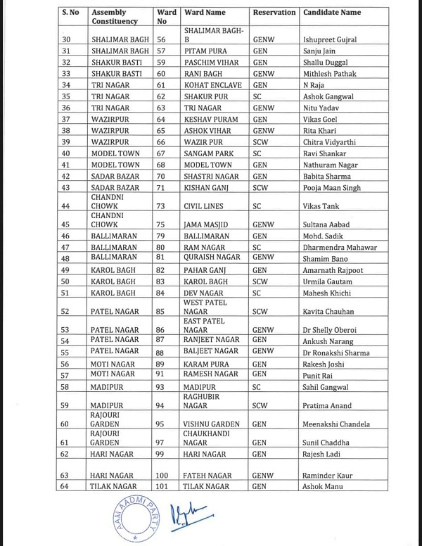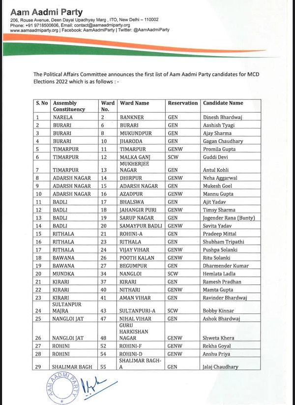 नई दिल्ली । आम आदमी पार्टी (Aam Aadmi Party) ने दिल्ली नगर निगम चुनाव (Delhi Municipal Corporation Election) के लिए उम्मीदवारों (candidates) की पहली लिस्ट (List) शुक्रवार देर शाम जारी कर दी है. कुल 134 उम्मीदवारों के नामों की घोषणा की गई है. पार्टी ने राजनीतिक मामलों की समिति की बैठक के बाद लिस्ट की घोषणा की है. वहीं बताया जा रहा है कि शेष 120 उम्मीदवारों की सूची आज शनिवार को जारी हो सकती है.