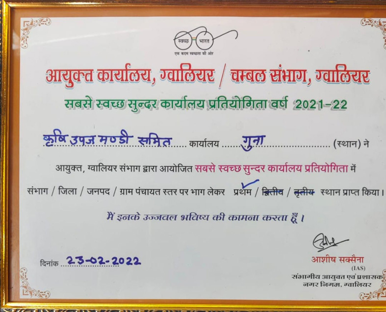 आंचलिक कार्यालय ग्वालियर द्वारा वित्तीय बर्ष 2022-23 की प्रथम छ: माही में ग्वालियर संभाग की ‘अÓ वर्ग की मण्डी समितियों में समग्र विषयों ( ई मण्डी, आय, आवक, ई अनुज्ञा, डाक नीलामी व्यवस्था, प्रांगण व्यवस्था, सौदा पत्रक, सी एम हेल्पलाइन, किसानों की समस्या का त्वरित निराकरण इत्यादि) की समीक्षा की गई जिसमें कृषि उपज मंडी समिति गुना को प्रथम स्थान प्राप्त हुआ।
