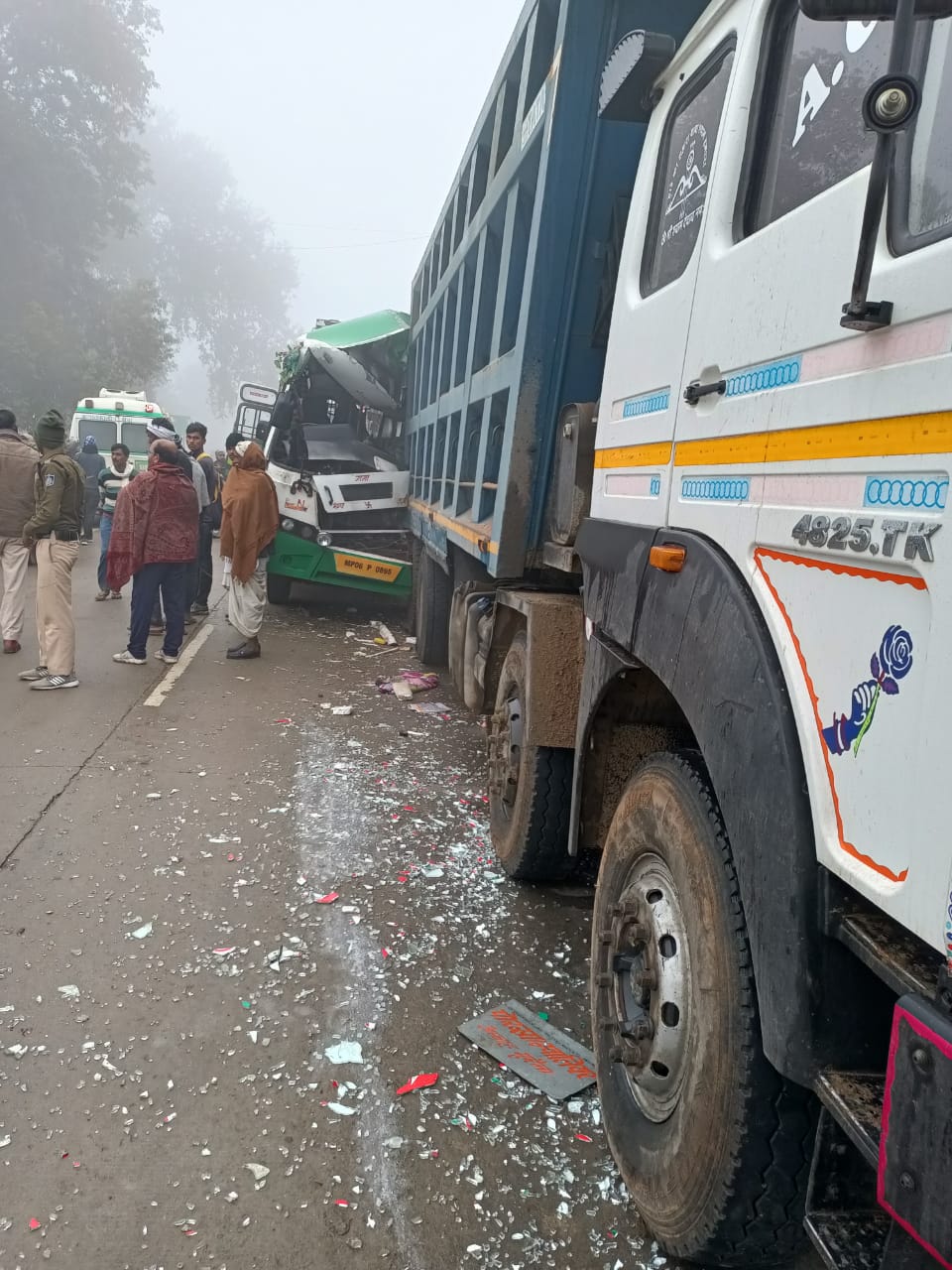 बताया जा रहा है कि बुधवार सुबह अंबाह से मुरैना आ रही यात्री बस जैसे ही जींगनी गांव के पास पहुंची वैसे ही सडक़ किनारे खराब खडे डंपर में पीछे से घुस गयी। कोहरे के कारण बस चालक को आगे खड़ा डंपर दिखाई नहीं दिया। दुर्घटना इतनी जोरदार थी कि बस का आधा हिस्सा डम्पर में घुस गया। इसी समय बस के पीछे आ रहे ट्रक चालक को भी बस दिखाई नहीं दी और ट्रक चालक ने बस में पीछे से टक्कर मार दी। इन वाहनों की भिड़ंत से तेज आवाज धमाके की हुई। इसे सुनकर ग्रामीण लोग घटना स्थल पर दौड़े आये वहीं पुलिस व प्रशासन को सूचना दी। थाना माताबसैया क्षेत्र के हाईवे पर जींगनी गांव के पास हुई दुर्घटना की जानकारी मिलते ही पुलिस प्रशासन ने मौके पर पहुंचकर ग्रामीणों के सहयोग से घायलों को निकालकर अस्पताल पहुंचाया।