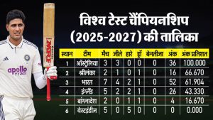 श्रीलंका दो मैचों में एक जीत और एक हार के साथ दूसरे स्थान पर है। उसका पॉइंट प्रतिशत 66.67% है। वहीं भारत, छह मैचों में तीन जीत, दो हार और एक ड्रॉ के साथ तीसरे स्थान पर बना हुआ है। दिल्ली टेस्ट जीतने के बाद भारत के कुल अंक 52 हो जाएंगे, लेकिन पॉइंट प्रतिशत के आधार पर वह अभी भी श्रीलंका से पीछे रहेगा। भारत की मौजूदा स्थिति मजबूत जरूर हुई है, लेकिन शीर्ष दो स्थानों पर पहुंचने के लिए टीम को दक्षिण अफ्रीका के खिलाफ आगामी टेस्ट सीरीज में अच्छा प्रदर्शन करना होगा। अगर भारत इसी लय में आगे बढ़ता रहा, तो विश्व टेस्ट चैंपियनशिप फाइनल 2027 में जगह बनाना मुश्किल नहीं होगा।