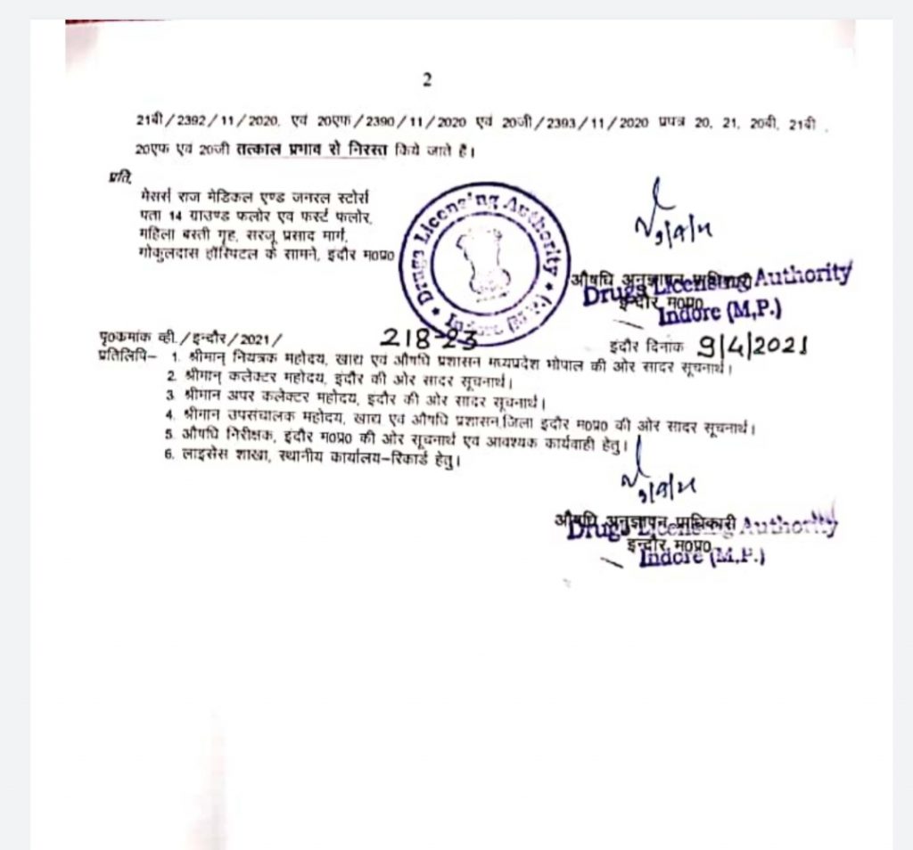 कार्यवाही कर राज मेडिकल स्टोर का विक्रय लाइसेंस खाद्य एवं औषधि प्रशासन ने निरस्त कर दिया गया है। दो दिन पहले कलेक्टर ने दुकान सील भी करवाई थी। राज मेडिकल स्टोर पूर्व भाजपा पार्षद मीना अग्रवाल के पति की दुकान अवैध भी है।