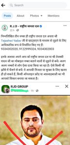 इस मामले के संज्ञान में आते ही आरजेडी ने अपने ऑफिशियल पेज पर नंबर जारी करते हुए बताया है कि तेजस्वी यादव के नाम पर फर्जीवाड़ा से सावधान रहे. आरजेडी ने सोशल मीडिया पर तीन नंबर 9334302020, 9122999324 और 9334302003 नंबर जारी किया है और बताया है कि यही वो तीन नंबर हैं जो तेजस्वी यादव या आरजेडी के वॉट्सएप प्लेटफॉर्म से जुड़ने के लिए आधिकारिक रूप से निर्धारित किया गया है. इसके अलावा किसी भी नंबर से तेजस्वी यादव या आरजेडी से जुड़ने के लिए बताने वालों से बचें.