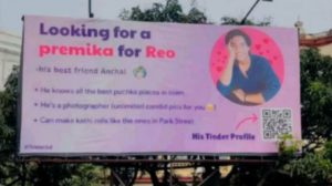 आंचल ने दोस्त रियो की तारीफ करते हुए लिखवाया है कि रियो को शहर में सबसे अच्छी गोलगप्पों की दुकान के बारे में पता है। इसके साथ ही वह एक अच्छा फोटोग्राफर भी है। जो भी उसकी गर्लफ्रेंड बनेगी, उसकी अनगिनत कैंडिड तस्वीरें खिंची जाएंगी। इसके अलावा पार्क स्ट्रीट में जिस तरह के काठी रोल मिलते हैं वैसा ही रोल रियो अपने हाथों से बना लेता है। होर्डिंग में आंचल ने रियो के टिंडर अकाउंट का क्यूआर कोड भी लगवाया है।