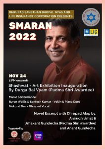आज यानी जुमेरात से इतवार तक (24 से 27 नवम्बर) पूरे चार रोज़ भोपाल में अदब (साहित्य) मौसिक़ी, संगतराशी और पेंटिंग की नायाब जुगलबंदी का मुज़ाहरा होने जा रहा है। इस नायाब पिरोगराम की मंसूबाबंदी की है रिवायती मौसिक़ी ध्रुपद को पूरी दुनिया मे मशहूर और मक़बूल करने वाले गुंदेचा घराने की 19वी पीढ़ी के पद्मश्री उमाकांत गुंदेचा और मरहूम पद्मश्री रमाकांत गुंदेचा के फज़ऱ्न्द और ध्रुपद गायकी के तालिबे इल्म अनंत गुंदेचा ने। भदभदा रोड पे बड़े तालाब की जद और कलियासोत के कुछ नज़दीक हरी भरी वादियों के बीच ध्रुपद संस्थान न्यास इस यादगार महफि़ल को सजा रहा है। मक़सद ये के आज से अगहन की गुलाबी ठंड और सर्द हवाओं के हमराह रिवायती मौसिक़ी ध्रुपद के कद्रदान वहां जमा होंगे। इस अनूठे प्रोग्राम को स्मरण 2022 उनवान दिया गया है। ये उन ध्रुपद के उस्तादों के नज़्र किया जा रहा है जो इस दुनियाए फानी से कूच कर चुके हैं। स्मरण की इब्तिदा मरहूम रमाकांत गुंदेचा की याद से हो रही है।