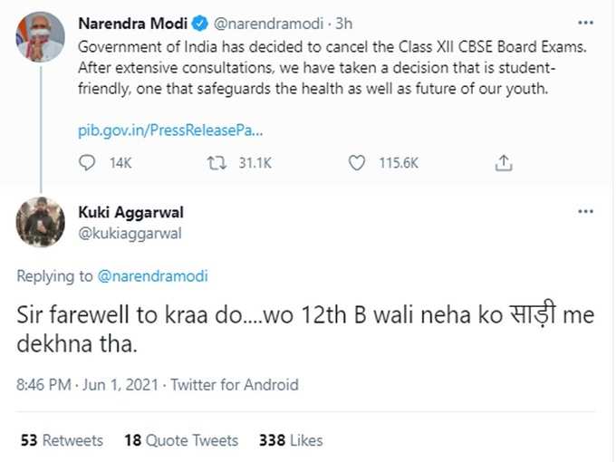 नई दिल्ली । कोरोना (corona) के मद्देनजर इस साल 12वीं कक्षा की बोर्ड परीक्षा (12th class board exam) रद्द कर दी गई। मंगलवार शाम प्रधानमंत्री नरेंद्र मोदी (Prime Minister Narendra Modi) की अध्यक्षता में हुई बैठक में यह फैसला लिया गया। इसकी घोषणा होते ही सोशल मीडिया पर त्योहार सा मनाया जाने लगा। वहीं, कई सारे फनी मीम्स भी शेयर किए जाने लगे। प्रधानमंत्री के ट्वीट पर लोगों के कॉमेंट्स हंस-हंस कर पेट फुला देने वाले हैं।
