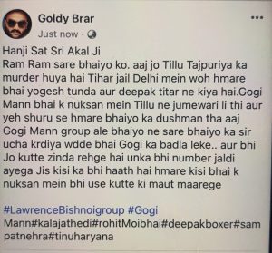गैंगस्टर गोल्डी (gangster goldie) ने फेसबुक पर पोस्ट करके कबूल किया है कि उसने ही टिल्लू की हत्या कराई है। गैंगस्टर गोल्डी ने लिखा कि आज जो दिल्ली की तिहाड़ जेल में टिल्लू ताजपुरिया का मर्डर हुआ है। वो हमारे भाई ने योगेश टुंडा और दीपक तीतर ने किया है। गोगी मान भाई के नुकसान में टिल्लू ने जिम्मेदारी ली थी और ये शुरू से ही हमारे भाइयों का दुश्मन था। आज गोगी मान ग्रुप वाले भाइयों का सिर ऊंचा कर दिया, बड़े भाई गोगी का बदला लेकर। उसने आगे लिखा कि और भी जो जिंदा रह गए हैं, उनका नंबर भी जल्द आएगा। जिस किसी का भी हाथ है, हमारे किसी भाई के नुकसान में उसे जल्द मौत के घाट उतारा जाएगा।