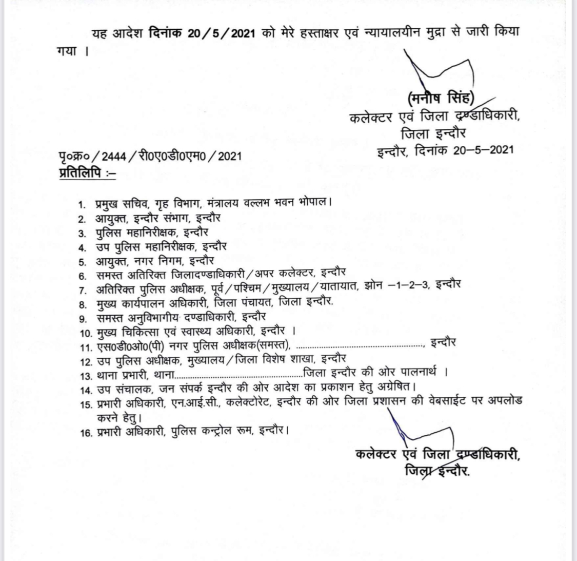 प्रदेश के मुख्यमंत्री शिवराज सिंह चौहान ने अपने इंदौर प्रवास के दौरान संभाग की क्राइसिस मैनेजमेंट ग्रुप (Crisis Management Group) के साथ वीडियो कॉन्फ्रेंसिंग के जरिए बात की। इस मीटिंग मे कहा गया कि 31 मई तक कोरोना कर्फ्यू में सख्ती बरती जाएगी। हालात सुधरने के उपरांत धीरे-धीरे आर्थिक गतिविधि शुरू की जाएंगी।
