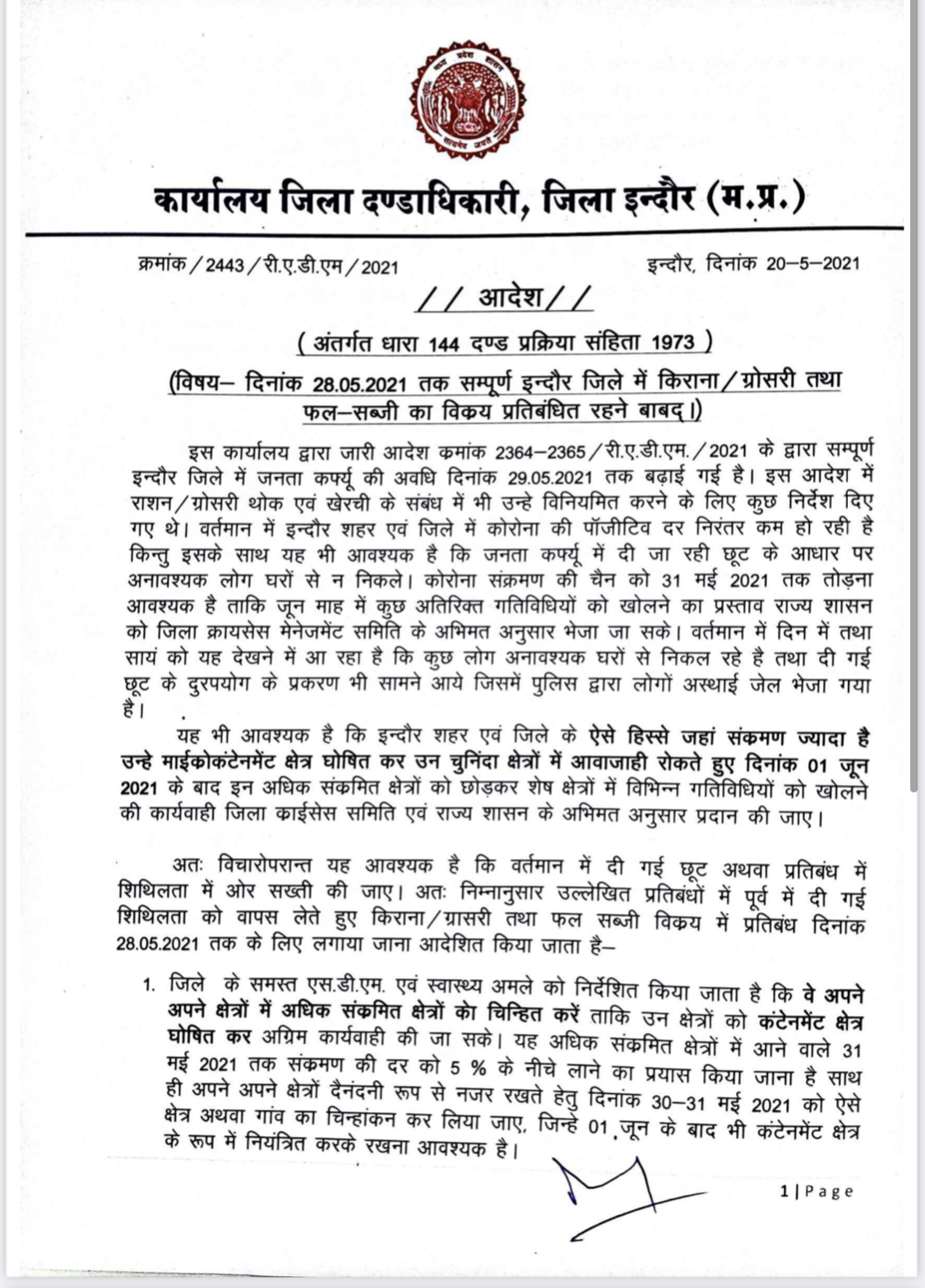 इंदौर। जिला प्रशासन ने अपने पुराने आदेश में संशोधन करते हुए आज रात एक नया आदेश जारी किया, जिसमें कल यानी 21 मई से लेकर 28 मई तक सभी किराना (Ration Shop) और ग्रॉसरी (Groceries Shop) की दुकानें बंद रहेंगी। इसके साथ-साथ फल और सब्जी भी नहीं बेची जाएगी। चोइथराम मंडी (Choithram Mandi) से भी फल और सब्जी का विक्रय नहीं होगा। कलेक्टर मनीष सिंह ने कहा कि इंदौर में कोरोना की संक्रमण पर काबू में आ रही है और इसे 30 तारीख तक काबू में करने के लिए कुछ करें निर्णय लेना पड़ रहे हैं हालांकि ऑनलाइन राशन सप्लाई करने वाली चैन चालू रहेगी।