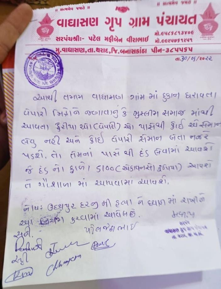 30 जून के लेटर पैड में कहा गया है कि वाघासन गांव के दुकानदारों को उदयपुर में टेलर की हत्या के मद्देनजर मुस्लिम समुदाय के फेरीवालों (व्यापारियों) से सामान नहीं खरीदना चाहिए. इस पर पूर्व सरपंच माफ़ीबेन पटेल के हस्ताक्षर और मोहर है. सोशल मीडिया पर तेजी से वायरल होने के बाद स्थानीय प्रशासन के संज्ञान में आए पत्र में कहा गया है, ‘अगर कोई दुकानदार मुस्लिम व्यापारियों से सामान लेते हुए देखा गया तो उस पर 5100 रुपये का जुर्माना लगाया जाएगा और वो पैसा योगदान गोशाला को दिया जाएगा.