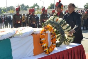धर्मशाला । हिमाचल प्रदेश (Himachal Pradesh) के मुख्यमंत्री जयराम ठाकुर (CM Jairam Thakur) ने शनिवार को यहां गग्गल हवाई अड्डे पर पैरा कमांडो लांस नायक विवेक कुमार (Lance Naik Vivek Kumar) के पार्थिव शरीर (Mortal remains) की अगवानी की(Receives), जिनकी तमिलनाडु में हेलीकॉप्टर दुर्घटना में मौत हो गई थी।