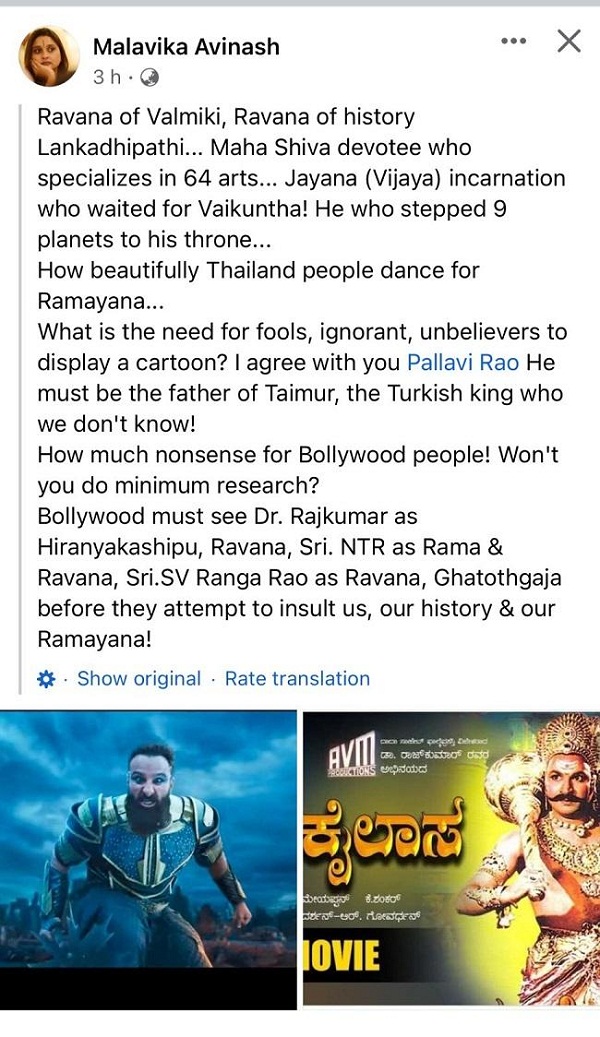 इसके अलावा बीजेपी की प्रवक्ता और मालविका (malvika) ने भी आदिपुरुष के बारे में बात की है. उन्होंने फेसबुक पर पोस्ट लिखा, ‘वाल्मीकि के रावण, इतिहास के रावण, लंकाधिपति, महाशिव(History of Ravana, Lankadhipati, Mahashiva) के भक्त जो 64 कलाओं में माहिर थे. जिन्होंने 9 ग्रहों को अपने सिहांसन में जड़वाया था. थाईलैंड के लोग कितनी खूबसूरती से रामायण (Ramayana) के लिए नाचते हैं. तो फिर इस कार्टून को बनाने की क्या जरूरत थी. मैं मानती हूं कि ये सही में तैमूर का पिता है. बॉलीवुड के लोग कितने बेवकूफ हैं. थोड़ी सी रिसर्च भी नहीं कर सकते.’