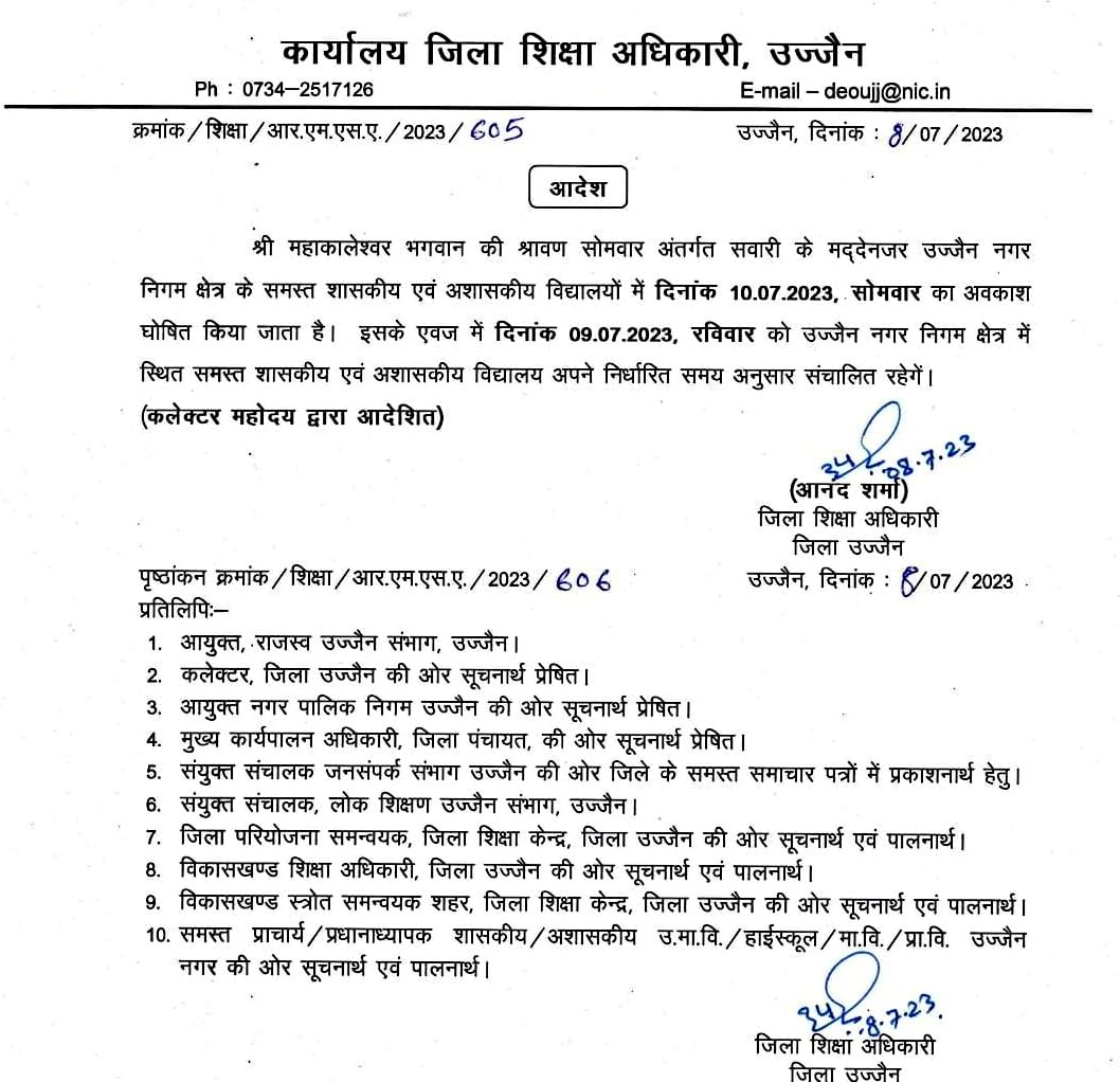 उज्जैन। मध्यप्रदेश के उज्जैन (Ujjain) में महाकालेश्वर भगवान (Lord Mahakaleshwar) की श्रावण सोमवार (Shravan Monday) अंतर्गत सवारी के मद्देनजर उज्जैन नगर निगम क्षेत्र (Ujjain Municipal Corporation area) के समस्त शासकीय-अशासकीय विद्यालयों में बाबा महाकाल की पहली सवारी पर सोमवार यानी 10 जुलाई को अवकाश घोषित किया है। वहीं, इसके स्थान पर रविवार यानी नौ जुलाई को उज्जैन नगर निगम क्षेत्र में स्थित समस्त शासकीय-अशासकीय विद्यालय अपने निर्धारित समय अनुसार संचालित होंगे। यह आदेश कलेक्टर कुमार पुरुषोत्तम के आदेश पर जिला शिक्षा अधिकारी आनंद शर्मा की ओर से जारी किया गया है।