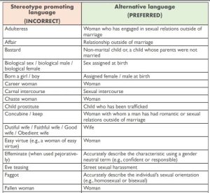 सुप्रीम कोर्ट ने अपनी वेबसाइट में विस्तार से सभी शब्दों की लिस्ट जारी की है, जिसमें अफेयर, करियर वुमेन, चाइल्ड प्रोस्टिट्यूट, फैगट, फैलन वुमेन, हुकर, हाउजवाइफ जैसे शब्दों को शामिल किया है, अब ऐसे शब्दों को किसी फैसले में नहीं लिखा जाएगा. इन शब्दों के अलावा महिलाओं के लिए इस्तेमाल होने वाले कई वाक्यों का भी जिक्र किया है, जिन्हें बदलने की सलाह दी गई है.