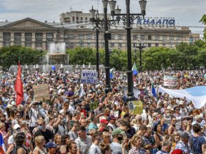 क्रेमलिन। रूस के दक्षिणपूर्वी शहर खबरोव्सक में हजारों लोग सड़कों पर हैं। चीन से सटे इस शहर में एक गवर्नर को हत्या के आरोप में गिरफ्तार कर लिया गया है जिसके खिलाफ दो हफ्ते से प्रदर्शन चल रहा है। 9 जुलाई को सर्जेई फुरगल को मॉस्को की जेल में डाल दिया गया था और रूस के राष्ट्रपति व्लादिमीर पुतिन ने उनकी जगह पर नए गवर्नर को भी नियुक्त कर दिया जबकि लोगों का कहना है कि सर्जेई के खिलाफ बिना आधार के आरोप लगाए गए हैं। प्रदर्शनकारियों की मांग है कि सर्जेई को खबरोव्स्क लाकर सुनवाई की जाए।