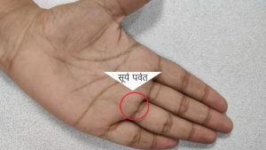हथेली पर सूर्य पर्वत : हाथ में अनामिका अंगुली (रिंग फिंगर) के नीचे का स्थान सूर्य पर्वत का होता है. इस जगह से कुंडली में सूर्य की स्थिति देखी जाती है. इसी स्थान से पता चलता है कि व्यक्ति को जीवन में कितना नाम और यश मिलेगा. व्यक्ति के शारीरिक स्वास्थ्य का पता भी इसी पर्वत से लगाया जा सकता है.