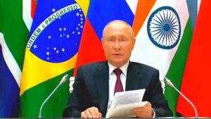 राष्ट्रपति पुतिन ब्रिक्स को मजबूत करने औरक अमेरिकी प्रभुत्व को कम करने को लेकर बात कर रहे थे। मार्च में अंतर्राष्ट्रीय आपराधिक न्यायालय (आईसीसी) द्वारा यूक्रेन में युद्ध अपराधों का आरोप लगाते हुए पुतिन के लिए गिरफ्तारी वारंट जारी हुआ था। इसके कारण वह व्यक्तिगत रूप से शिखर सम्मेलन में भाग लेने में असमर्थ थे। रूस ने यूक्रेन के आरोप को अपमानजनक बताते हुए खारिज कर दिया और कहा कि इस कदम का कोई कानूनी अर्थ नहीं है, क्योंकि वह आईसीसी का सदस्य नहीं है। हालांकि, दक्षिण अफ़्रीका एक सदस्य है, जिसका अर्थ है कि यदि वह वहाँ गया होता तो उसे गिरफ्तार करना बाध्य होता। राष्ट्रपति पुतिन ने बुधवार को ब्रिक्स नेताओं के एक शिखर सम्मेलन में रूस को यूक्रेन युद्ध का बचाव करने और अमेरिकी वैश्विक प्रभुत्व के प्रति संतुलन के रूप में समूह की प्रशंसा करने के लिए प्रस्तुत किया।
