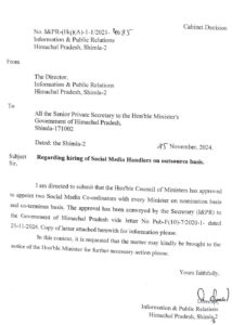 हिमाचल प्रदेश सरकार के सूचना एवं जनसंपर्क विभाग की तरफ से सीएम के सभी निजी सेक्रेटरी को पत्र लिखा है. पत्र में कहा गया है कि आउटसोर्स आधार पर ये सभी सोशल मीडिया कॉर्डिनेटर रखने के लिए पहले ही सरकार की तरफ से मंजूरी दे दी गई थी. सूचना एवं जनसंपर्क विभाग ने पत्र में लिखा कि हर मंत्री के लिए दो सोशल मीडिया कॉर्डिनेटर रखे जाएंगे. सूत्र बताते हैं कि इन्हें 30 हजार रुपये प्रतिमाह सैलरी दी जाएगी.