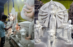 उज्जैन। शहर में मां दुर्गा पर्व नवरात्रि की शुरुआत 3 अक्टूबर से हो रही है। कारीगर मां दुर्गा की प्रतिमा तैयार करने में जुटे हुए हैं। खास बात यह है कि उज्जैन में बंगाली कलाकार कोलकाता के गंगा घाट की मिट्टी, कानपुर के बास और पंजाब के करनाल से मंगवाई गई घास से दुर्गा प्रतिमाओं को अंतिम रूप देने में जुटे हैं। इसके अलावा इसमें वेश्या वाड़ी से मंगवाई गई मिट्टी का भी इस्तेमाल किया जाता हैं।