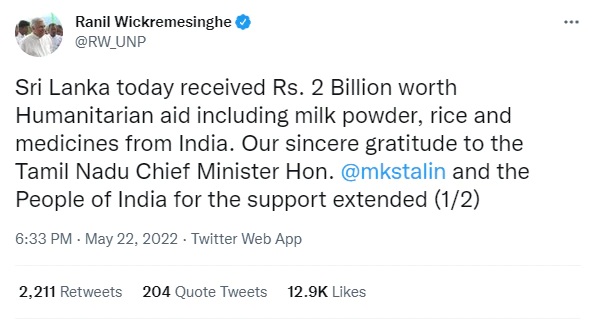 भारत की ओर से भेजी गई करीब दो अरब रुपये की मानवीय सहायता आज श्रीलंका पहुंच गई है. इसमें दूध पाउडर, चावल और दवाओं समेत कई जरूरी चीजें शामिल हैं. इसके लिए श्रीलंका के प्रधानमंत्री रानिल विक्रमसिंघे ने ट्वीट कर भारत सरकार का आभार जताया है. श्रीलंका के प्रधानमंत्री ने ट्वीट किया, “श्रीलंका को आज भारत की ओर से दूध पाउडर, चावल और दवाओं समेत दो अरब मूल्य की मानवीय सहायता मिली है. इसके लिए मैं भारत की जनता, विशेष रूप से तमिलनाडु के मुख्यमंत्री के समर्थन की सराहना करता हूं.”