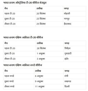 भारत और दक्षिण अफ्रीका के बीच पहला टी-20 त्रिवेंद्रम में 28 सितंबर, दूसरा टी-20 गुवाहाटी में एक अक्तूबर और तीसरा टी-20 इंदौर में तीन अक्तूबर को खेला जाएगा। इसके बाद टीम इंडिया दक्षिण अफ्रीका के खिलाफ तीन मैचों की वनडे सीरीज भी खेलेगी। इसका पहला मैच छह अक्तूबर को रांची में, दूसरा मैच नौ अक्तूबर को लखनऊ में और तीसरा मैच 11 अक्तूबर को दिल्ली में खेला जाएगा।