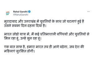 राहुल गांधी नें कहा, “उत्तराखंड और मुरादाबाद में युवतियों के साथ जो घटनाएं हुई हैं, उसने सबका दिल दहला दिया है। भारत जोड़ो यात्रा में मैं कई प्रतिभाशाली बच्चियों और युवतियों से मिल रहा हूं, उन्हें सुन रहा हूं। एक बात साफ है, हमारा भारत तभी आगे बढ़ेगा, जब देश की महिलाएं सुरक्षित होंगी।”