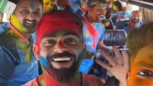 नई दिल्ली: रोहित शर्मा (Rohit Sharma), विराट कोहली (Virat Kohli) ने मंगलवार को गजब की होली (Holi 2023) खेली. भारतीय टीम (Indian team) होली के मौके पर एक अलग ही मूड में नजर आई. टीम बस में रोहित ने जमकर गुलाल उड़ाया. उन्होंने विराट कोहली पर रंग फेंके. कोहली भी रंगों के इस त्योहार में लाल- पीले रंग से रंगे हुए नजर आए. रोहित, कोहली, श्रेयस अय्यर, शुभमन गिल की मस्ती को देखकर तो फैंस यहां तक कहने लगे कि इन्हें क्या हो गया. कोहली तो खुद को डांस करने से रोक नहीं पाए.