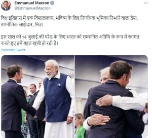 फ्रांस के राष्ट्रपति इमानुएल मैक्रों ने भारत की मातृभाषा हिंदी में ट्वीट किया, जिसमें उन्होंने लिखा ‘विश्व इतिहास में एक विशालकाय, भविष्य के लिए निर्णायक भूमिका निभाने वाला देश, रणनीतिक साझेदार, मित्र। इस साल की 14 जुलाई की परेड के लिए भारत को सम्मानित अतिथि के रूप में स्वागत करते हुए हमें बहुत खुशी हो रही है।’