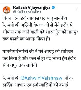 यात्रियों की सुविधाओं को ध्यान में रखते हुए कई कार्य किए जा रहे हैं वहीं ट्रेनों की संख्या में भी इजाफा किया जा रहा है। सबसे ज्यादा सेमी हाईस्पीड वंदे भारत की संख्या बढ़ाई जा रही है। कैलाश विजयवर्गीय ने हाल ही में इंदौर आए रेल मंत्री अश्विनी वैष्णव से इंदौर से भोपाल के बीच चलने वाली वंदे भारत ट्रेन को नागपुर तक बढ़ाने का आग्रह किया था। जिसे स्वीकार कर लिया गया है।