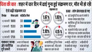 इंदौर। कोरोना की वैक्सीन क्या आ गई… शहर के लोग बेपरवाह हो गए। शायद उन्हें लगा कि सब ठीक हो गया है…लेकिन यह भूल कहीं भारी न पड़ जाए। हम डरा नहीं रहे हैं, आप को सतर्क कर रहे हैं, क्योंकि वैक्सीन की प्रक्रिया और असर की अवधि पूरी होना अभी बाकी है। ऐसे में संभल जाएं, क्योंकि कोरोना के मरीजों की संख्या फिर बढ़ने लगी है। चार दिन में संक्रमण की दर ढाई गुना बढ़ चुकी है।