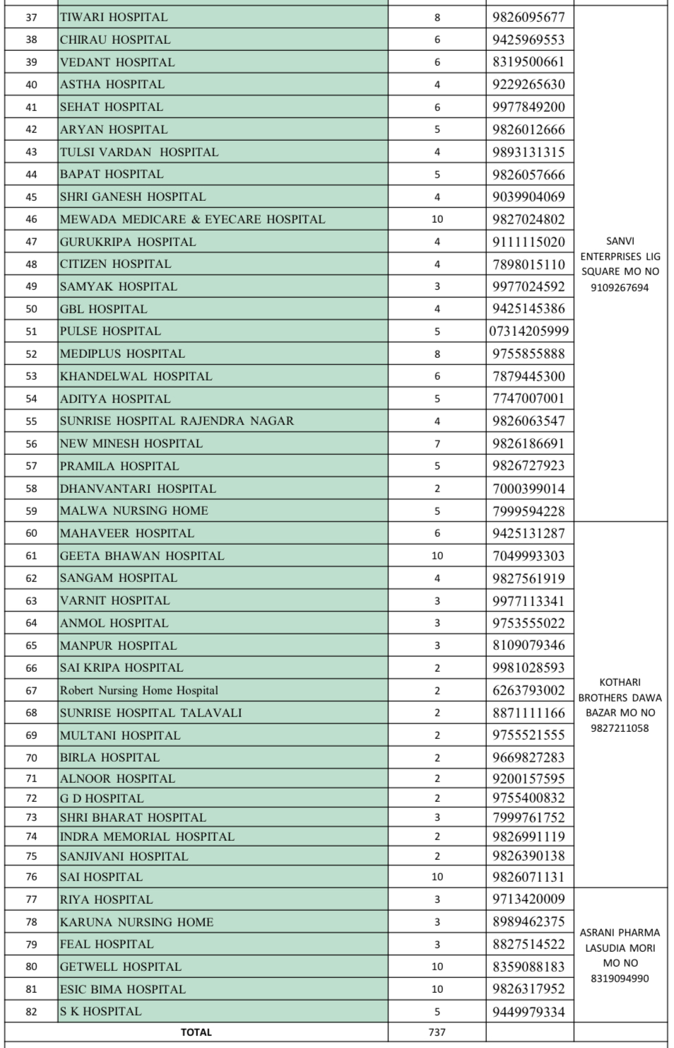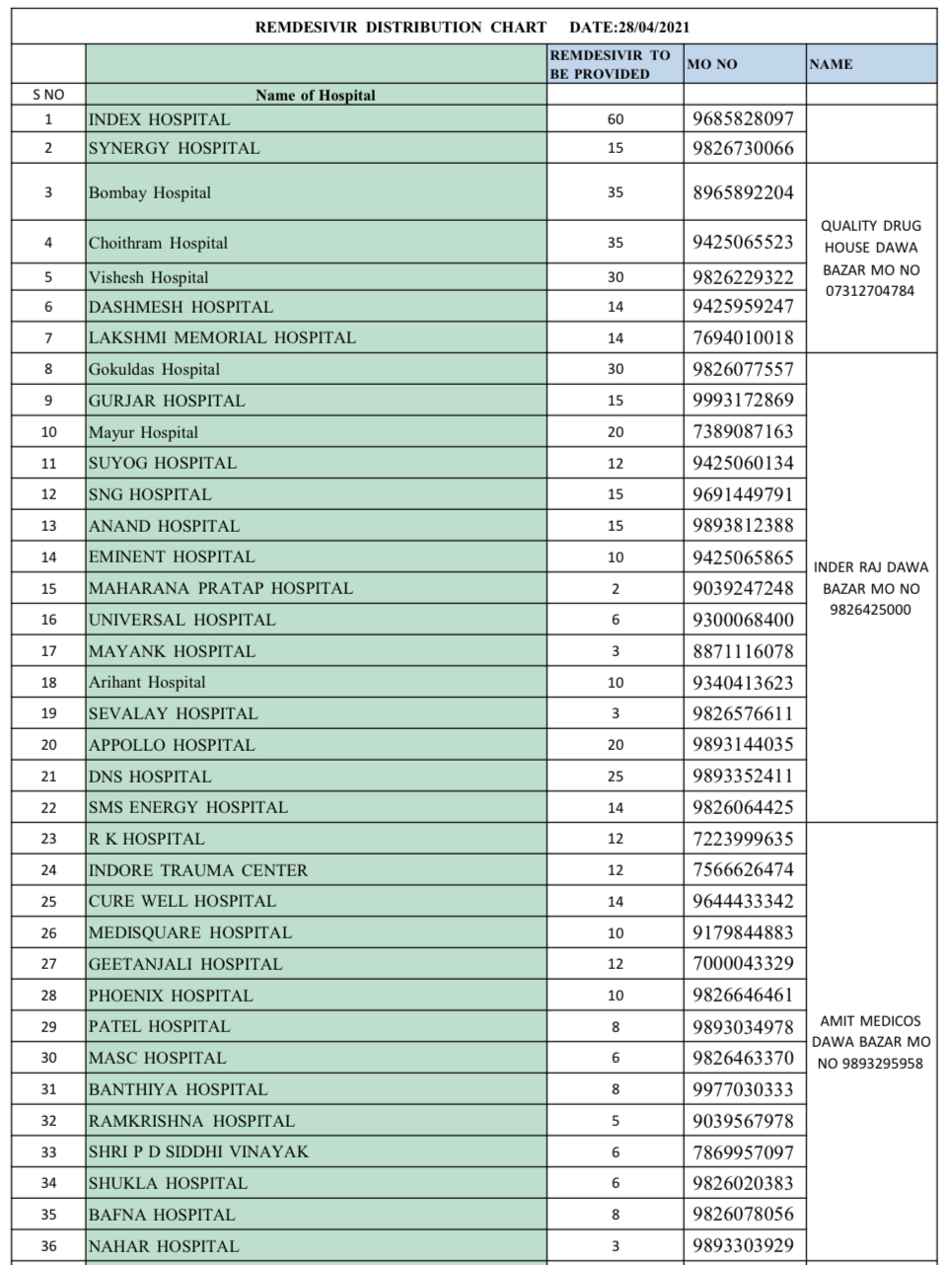 इंदौर। इंदौर के 96 अस्पतालों को बुधवार को कोरोना वाइरस में कारगर दवा 1581 रेमडिसिवर इंजेक्शन (Remdesivir Injection) मिले हैं। इसमें से 82 अस्पतालों को 737 और 14 अन्य अस्पतालों को 844 इंजेक्शन मिले है। 82 अस्पतालों को स्टाकिस्ट (Sockist) के माध्यम से और 14 अस्पतालों को सीधे दवा कंपनियों की ओर से उनके मेडिकल स्टोर को सप्लाई किए गए।