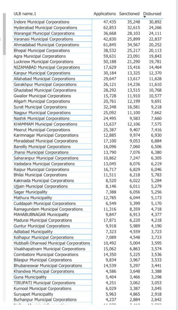 मध्यप्रदेश के बुरहानपुर जैसे शहर को मात्र 4745 हितग्राहियों को लोन दिये जाने का लक्ष्य दिया गया था, वह केवल 2642 लोगों को योजना का लाभ देकर पीछे रह गया। इसी तरह सतना, सिंगरौली, रीवा, छिंदवाड़ा, मुरैना जैसे शहर भी 5 से 6 हजार का लक्ष्य पूरा नहीं कर पाए।