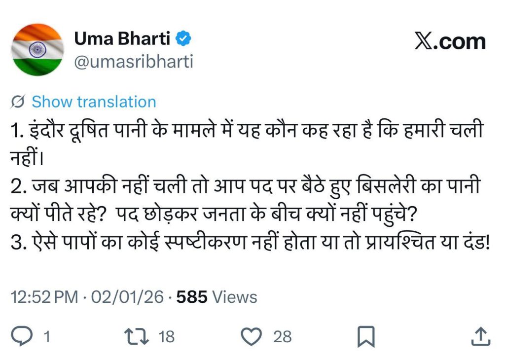चौंकाने वाली बात यह है कि बीजेपी की वरिष्ठ नेता उमा भारती ने भी अपनी ही पार्टी की सरकार और स्थानीय नेतृत्व पर सवाल खड़े कर दिए हैं। उन्होंने सोशल मीडिया पर लिखा, “जब आपकी नहीं चली तो आप पद पर बैठे हुए बिसलेरी का पानी क्यों पीते रहे? पद छोड़कर जनता के बीच क्यों नहीं पहुंचे? ऐसे पापों का कोई स्पष्टीकरण नहीं होता, या तो प्रायश्चित या दंड!” उमा भारती के इस बयान ने स्थानीय प्रशासन और नेताओं की मुश्किलें बढ़ा दी हैं।