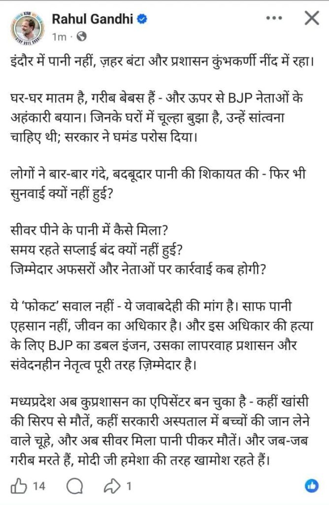 कांग्रेस नेता राहुल गांधी ने सोशल मीडिया के माध्यम से मध्य प्रदेश सरकार और प्रशासन पर कड़ा प्रहार किया है। उन्होंने कहा कि “इंदौर में पानी नहीं, ज़हर बांटा गया और प्रशासन कुंभकर्णी नींद में रहा।” गांधी ने आरोप लगाया कि सीवर का पानी पीने के पानी में मिलना प्रशासन की घोर लापरवाही है। उन्होंने इसे ‘जीवन के अधिकार की हत्या’ करार देते हुए ‘डबल इंजन’ सरकार की जवाबदेही पर सवाल उठाए।