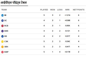 मुंबई इंडियंस ने अपने पांच में से तीन मैच में जीत दर्ज करते हुए प्वाइंट्स टेबल में पहला स्थान हासिल कर लिया। टूर्नामेंट में मुंबई इंडियंस का नेट रन रेट बेहद ही शानदार रहा है। रोहित शर्मा की अगुवाई वाली टीम ने +1.21 के नेट रन रेट के साथ पहले स्थान पर कब्जा जमाए रखा। दिल्ली कैपिटल्स की टीम चार में से तीन मैच जीत चुकी है। अय्यर की अगुवाई वाली इस टीम का नेट रन रेट +0.59 है। रॉयल चैलेंजर्स बैंगलोर की टीम -0.95 के नेट रन रेट के साथ 6 प्वाइंट लेकर तीसरे पायदान पर है।