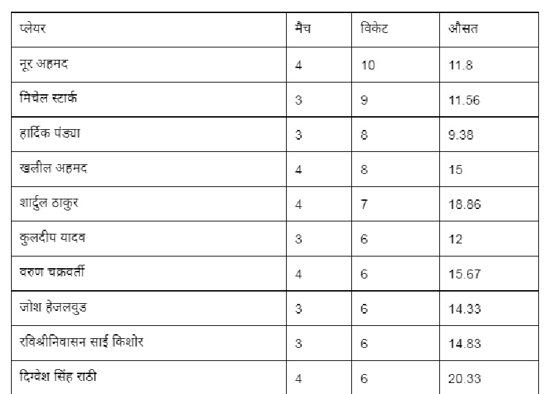 आईपीएल 2025 में सबसे ज्यादा विकेट लेने वाले गेंदबाजों की बात करें तो यहां चेन्नई सुपर किंग्स के नूर अहमद और दिल्ली कैपिटल्स के मिचेल स्टार्क के बीच जबरदस्त जंग देखने को मिल रही है। नूर ने अभी तक 10 विकेट हासिल किए हैं तो स्टार्क 9 शिकार कर चुके हैं। हालांकि भारतीय गेंदबाज भी पीछे नहीं हैं। इन दोनों के बाद लिस्ट में अगले 5 गेंदबाज भारतीय ही हैं। हार्दिक पांड्या और खलील अहमद 8-8 विकेट के साथ क्रमश: तीसरे और चौथे पायदान पर हैं। पर्पल कैप की रेस में शामिल टॉप-10 गेंदबाजों में 7 भारतीय हैं।