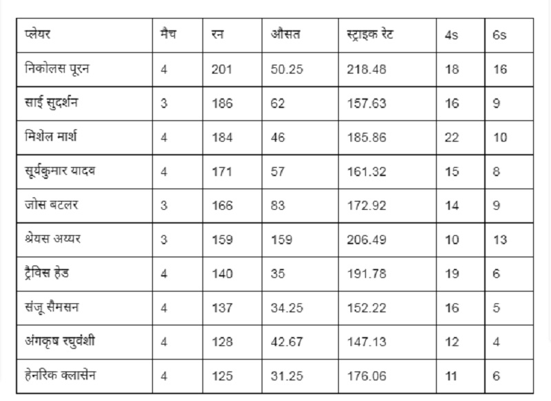 लखनऊ सुपर जाएंट्स के विस्फोटक बल्लेबाज निकोलस पूरन आईपीएल 2025 में सबसे ज्यादा रन बनाने वाले बल्लेबाजों की रेस में टॉप पर हैं। वह सीजन में 200 रन का आंकड़ा पार करने वाले अभी तक एकमात्र खिलाड़ी हैं। उनके बल्ले से 4 मैचों में 201 रन निकले हैं। वहीं टॉप-10 बल्लेबाजों की इस लिस्ट में 5 भारतीय और इतने ही विदेशी खिलाड़ी हैं।
