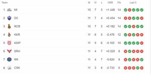 मुंबई इंडियंस, दिल्ली कैपिटल्स और रॉयल चैलेंजर्स बैंगलोर का आईपीएल के प्लेऑफ में पहुंचना लगभग तय है। इन तीनों टीमों के खाते में 14-14 अंक हैं। मुंबई की टीम फिलहाल प्वाइंट्स टेबल में टॉप पर है। मुंबई का नेट रनरेट 1.448 है। इसके बाद दिल्ली और आरसीबी का नेट रनरेट भी प्लस में है। दिल्ली की टीम को अभी 3 मैच और खेलने हैं। जबकि मुंबई और बैंगलोर की टीमें 4-4 मैच और खेलेगी। लिहाजा इन टीमों का आखिरी चार में खेलना लगभग तय है।