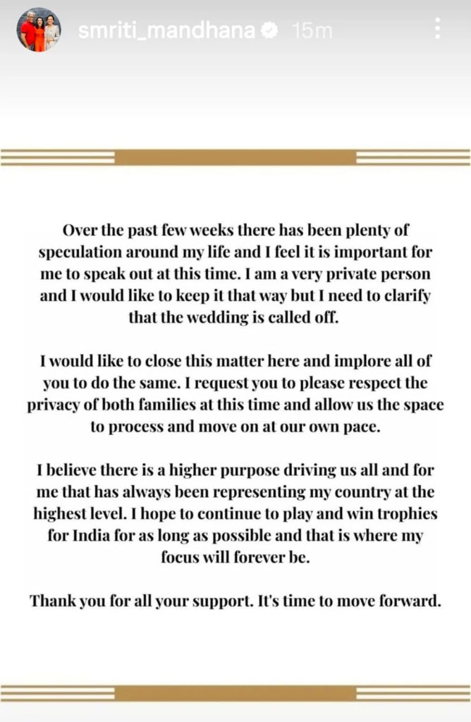 मंधाना ने रविवार को इंस्टाग्राम स्टोरी पर लिखा, पिछले कुछ सप्ताह से मेरे जीवन को लेकर काफी अटकलें लगाई जा रही हैं और मुझे लगता है कि इस समय मेरे लिए खुलकर बोलना जरूरी है। मैं बहुत निजी इंसान हूं और मैं इसे इसी तरह रखना चाहती हूं, लेकिन मुझे यह स्पष्ट करना होगा कि शादी रद्द कर दी गई है। मैं इस मामले को यहीं समाप्त करना चाहती हूं और आप सभी से भी यही करने की विनती करती हूं। मैं आपसे अनुरोध करती हूं कि इस समय दोनों परिवारों की निजता का सम्मान करें और हमें अपनी गति से आगे बढ़ने का समय दें।