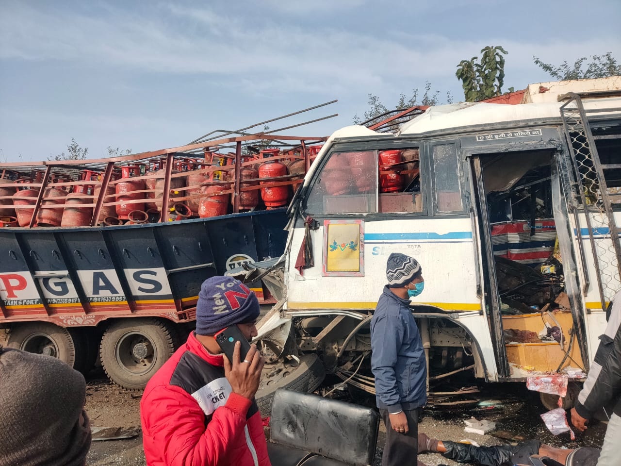 इस संबंध में डीसी वरूण रंजन और एसपी हृदीप पी जनार्दनन सदल बल पहुंच गए हैं। बचाव कार्य जारी है। वाहनों में फंसे लोगों को गैस कटर की सहायता से निकालने का काम जारी है। जानकारी के मुताबिक कृष्णा रजत बस और एलपीजी सिलेंडर से भरे ट्रक में आमने-सामने की जोरदार टक्कर हुई। तेज रफ्तार वाले एलपीजी सिलेंडर लदे ट्रक ने बस में टक्कर मार दी। टक्कर इतनी तेज थी कि दोनों गाड़ियों के परखचे उड़ गए। मृतकों में अधिकांश लोग बस यात्री हैं। टक्कर होते ही बस में सवार कई लोग सड़क पर आ गिरे। फिलहाल सात लोगों के मरने व दो दर्जन से ज्यादा लोगों के घायल होने की पुष्टि की जा चुकी है। साथ ही कहा है कि मरने वालों और घायलों की संख्या बढ़ भी सकती है।