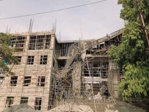 गिरिडीह: झारखंड के गिरिडीह शहर के ऑफिसर कॉलोनी में करीब 40 करोड़ रुपये की लागत से बन रहे नगर निगम के नए भवन का सामने का हिस्सा पूरी तरह से गिर गया है. घटना में मौके पर काम कर रहे करीब दो दर्जन से अधिक मजदूर बाल-बाल बच गए. भवन का सामने का हिस्सा गिरने के बाद संवेदक के द्वारा मरम्मत कार्य तेज कर सभी काम को दुरुस्त करने में जुट गया है.