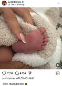 जस्टिन बीबर और हैली ने वर्ष 2018 में शादी रचाई। अब दोनों के जीवन का नया अध्याय शुरू हुआ है। बेटे के रूप में कपल के घर खुशियों ने दस्तक दी है। जस्टिन ने इंस्टाग्राम पोस्ट के जरिए फैंस के साथ यह खुशखबरी साझा की है। साथ ही बच्चे का नाम भी बताया है। जस्टिन ने बच्चे की जो तस्वीर साझा की है, उसमें बच्चे के पैर दिखाई दे रहे हैं। इसके साथ लिखा है, ‘हमारे घर में तुम्हारा स्वागत है, बेबी’। जस्टिन ने बच्चे का नाम जैक ब्लूज बीबर (ACK BLUES BIEBER) रखा है।