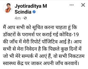 ज्योतिरादित्य सिंधिया कोरोना पॉजिटिव, संपर्क में आए लोगों से की जांच की अपील