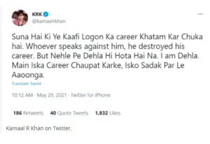 नई दिल्ली। कमाल आर खान (KRK) इन दिनों काफी सुर्खियों में है। पिछले दिनों सलमान खान (Salman Khan) ने कमाल के खिलाफ केस दर्ज करवाया था और अब कमाल अपने ट्वीट में बिना किसी का नाम लिए उसका करियर बर्बाद करने की धमकी दे रहे हैं।